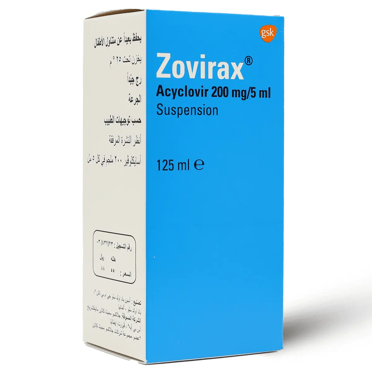 Zovirax Suspension (معلق زوفيراكس) هو دواء مضاد للفيروسات يستخدم لعلاج مجموعة متنوعة من العدوى التي تسببها فيروسات الهربس. يحتوي على المادة الفعالة أسيكلوفير (Acyclovir)، والتي تعمل عن طريق منع تكاثر الفيروسات في الجسم.